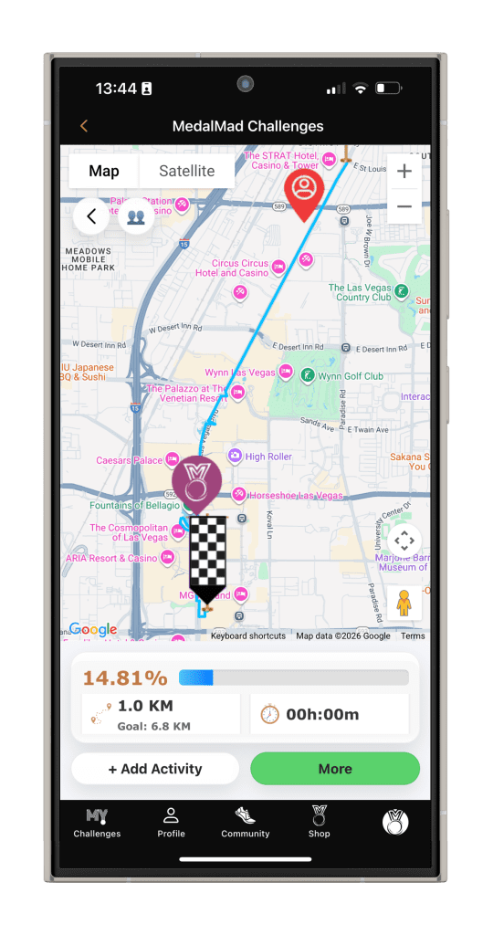 Take on he Las Vegas Strip: Embark on our iconic Viva Las Vegas virtual challenge and take a thrilling trip down the famous Las Vegas Strip. With each milestone you reach, unlock a new chapter of the journey, immersing yourself in the glitz and glamour of this vibrant city.